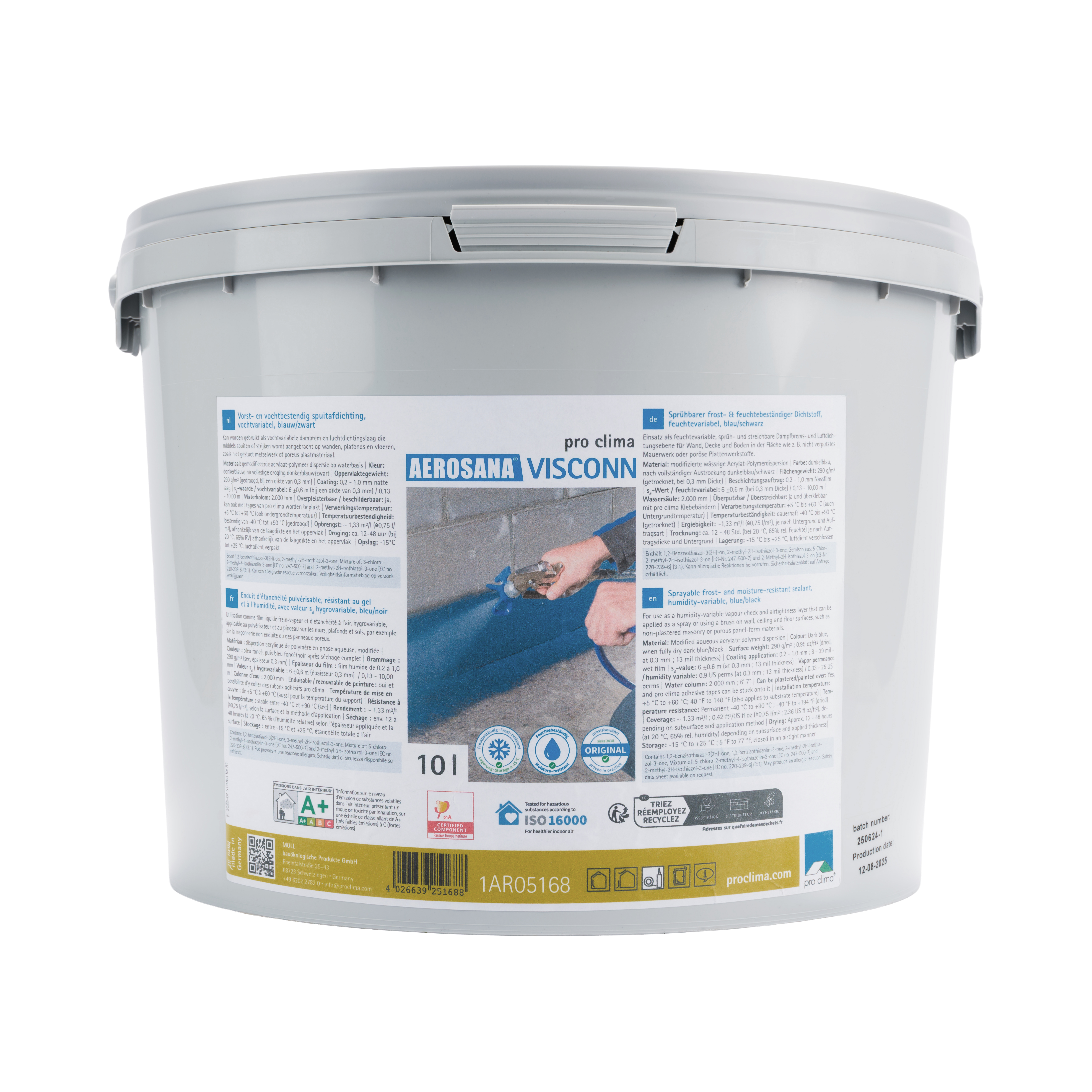 AEROSANA VISCONN es una pasta de dispersión acrílica en base de agua que se puede aplicar por rociado o como pintura. Una vez aplicada crea tras el tiempo de secado una película elástica sin fisuras que forma el plano de hermeticidad al aire y reguladora de vapor. La adhesión funciona en todos los materiales habituales en la construcción, en todas las láminas pro clima y en láminas de aluminio o papel.